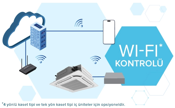 Cihazlar mobil uygulama aracılığıyla rahatlıkla her yerden kontrol edilir. Duvar tipi, kanal tipi ve konsol tipi cihazlarda standart olarak sunulan Wi-Fi, 4 yönlü ve tek yön kaset tiplerinde opsiyoneldir.